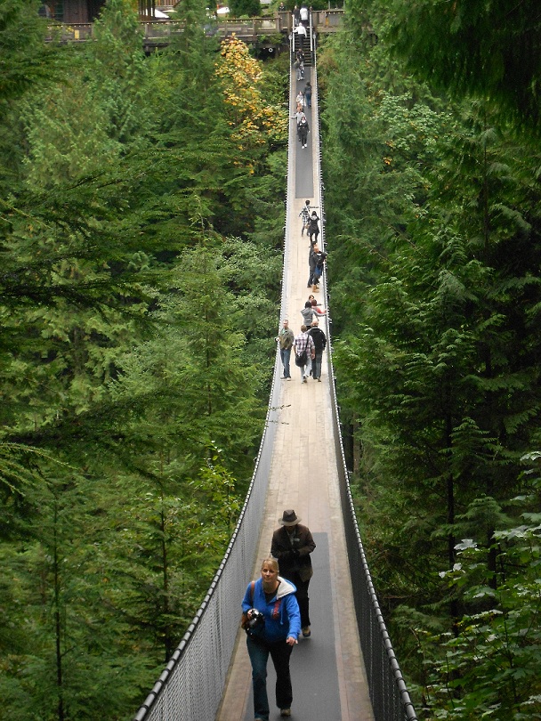 Daarna stappen we op de seaboat naar Vancouver North om de broodnodige adrenalinekick te krijgen. In het Capilano suspension bridge park tref je hangbrug/touwbrug/wiebelbrug…of hoe je een enge brug op hoge hoogte ook wilt noemen….je treft er nog hogere glazen bodem uitkijkposten en een aantal andere minder spannende bruggen door bomen etc. Hoewel de brochure er veel belovend uit ziet en er inderdaad een meisje bijna huilend van 1 van de bruggen af komt vinden wij het nogal meevallen. Hoewel ik de eerste keer over die “ene lange wiebelbrug” toch even moest slikken. We pikken veel van de natuur mee, wandelen wat af en voor we het weten is de dag alweer bijna voorbij. Met het openbaar vervoer gaan we dan ook weer terug naar ons hotel.